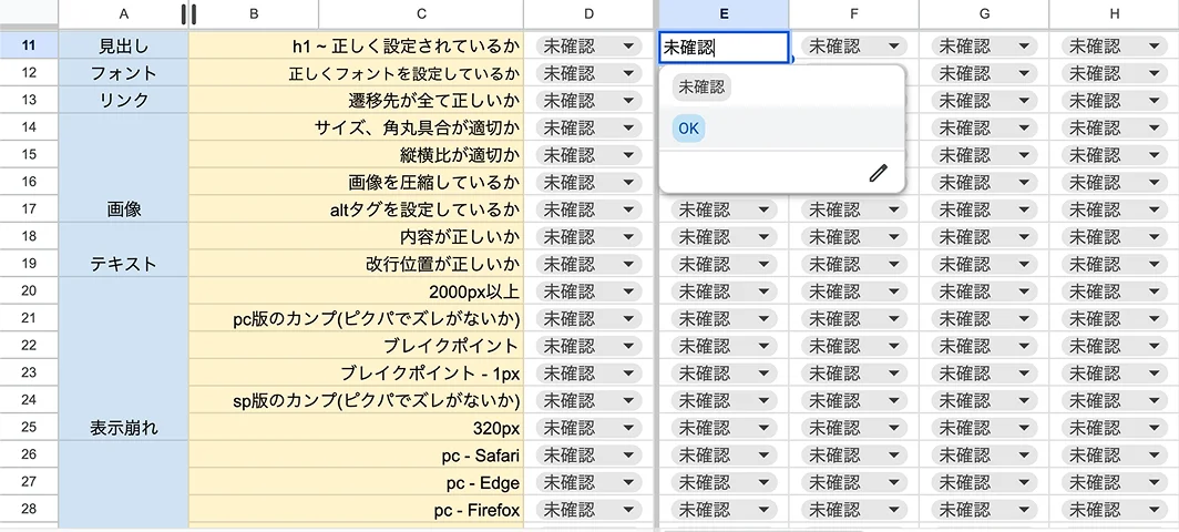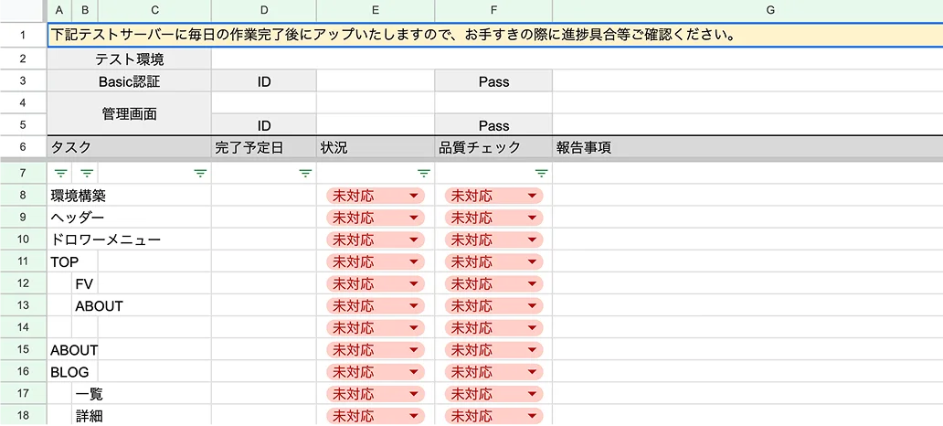 上記は実際に使用している「進捗管理シート」「品質チェックシート」(一部抜粋)です。